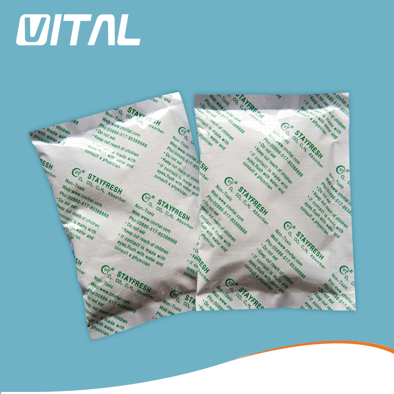 1)調節產品內的氧氣、二氧化碳濃度,降低果蔬生理活性,清除乙烯、乙醇、甲醛、乙醛等有害的代謝產物